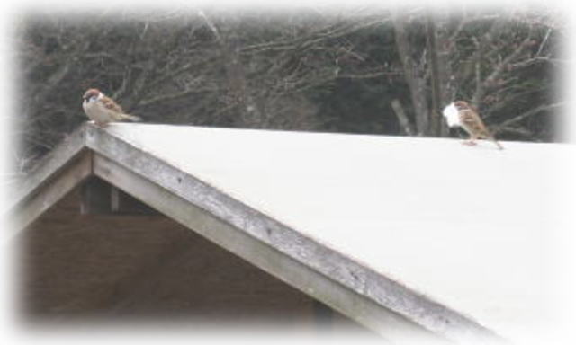 そんな今日の一枚は、すずめさんです。 右のすずめさん、アヒルの毛をくわえています。 実は写真撮る前は左のすずめもくわえていました。 すずめの餌はアヒルの毛です と間違えそうになるぐらい不思議な光景でした。 |
