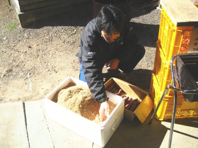 管理人のあつしです!! 芋ほり大会には参加できませんでしたが、犬キャンで販売しているの芋を掘っていますヽ(´ロ`) もみがらって以外にあったかいんですよ☆ |