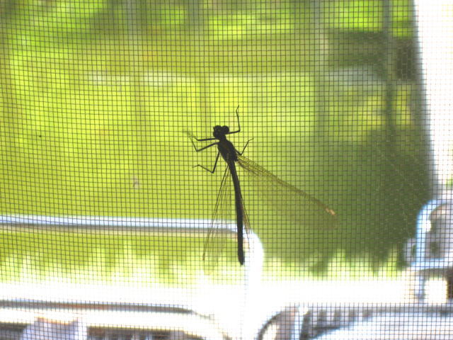 さて、今日の一枚。 事務所内に迷い込んだとんぼ様。 網戸におしりをつけています。。。 丁度その先には池があるので、池と勘違いして卵をつけようとしたんでしょうか。。。